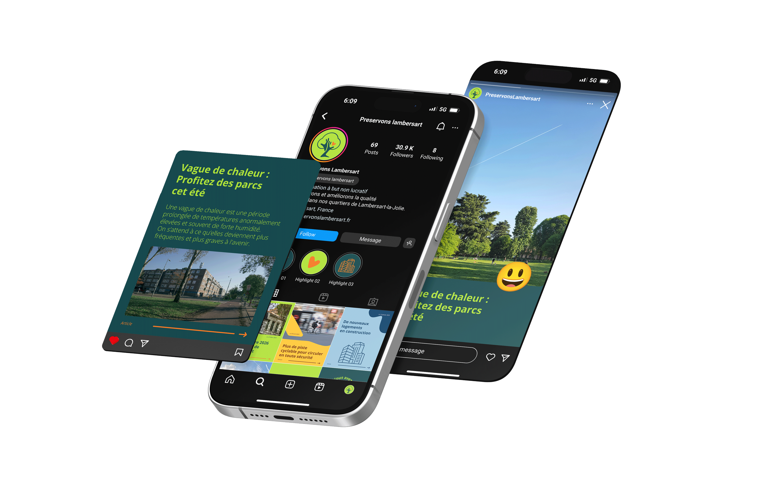 L’association Préservons Lambersart avait besoin de mettre en place une vraie identité visuelle afin d’être reconnaissable sur ses différents supports de communication. De plus, elle souhaitait toucher un public plus jeune par une présence sur de nouveaux canaux de diffusion comme Instagram. L’objectif a été de regrouper les messages de l’association en trois pôles (sécurité, urbanisme et les informations locales) afin d’avoir des prises de parole claires et facilement reconnaissables. Le logo évoque à la fois le symbole de la ville au travers de l’arbre et l’engagement citoyen avec les mains formant le tronc, le cœur représentant le fruit.